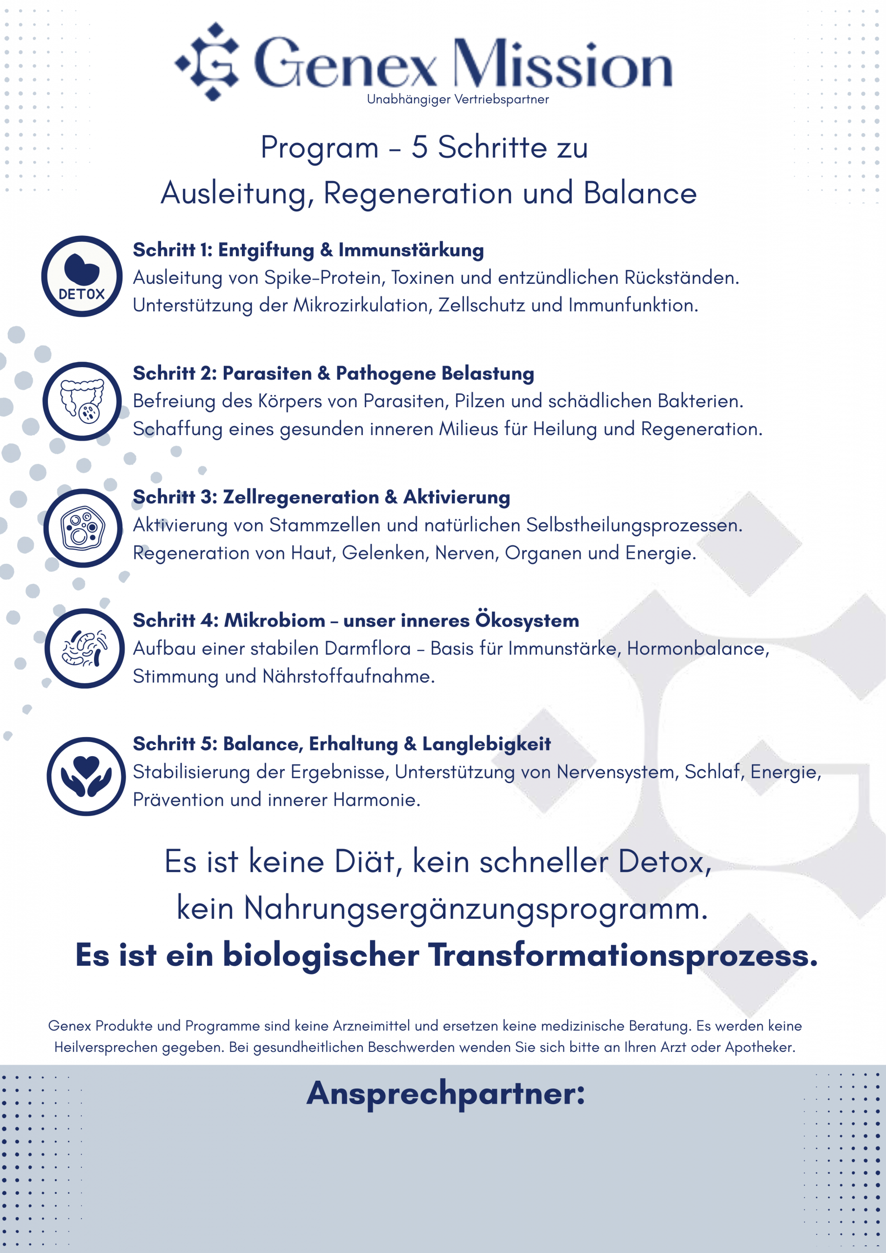Damit du die besten Ergebnisse mit den Genex-Produkten erzielst, orientiere dich an den empfohlenen Einnahmehinweisen während des Programms. So kann sich dein Körper Schritt für Schritt regenerieren und in sein natürliches Gleichgewicht zurückfinden.